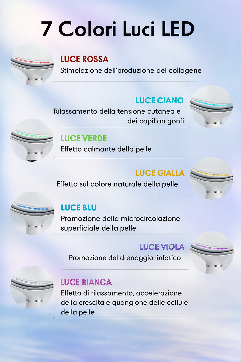 Ogni colore supporta specifici benefici per la pelle, aiutando a migliorare tono, compattezza e luminosità.