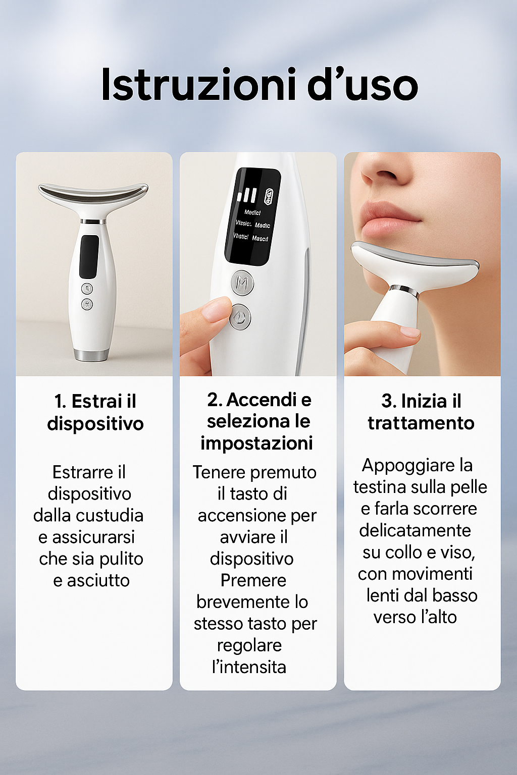 Progettato per adattarsi perfettamente ai contorni di viso e collo, offre un’esperienza di trattamento professionale, delicata ma efficace.