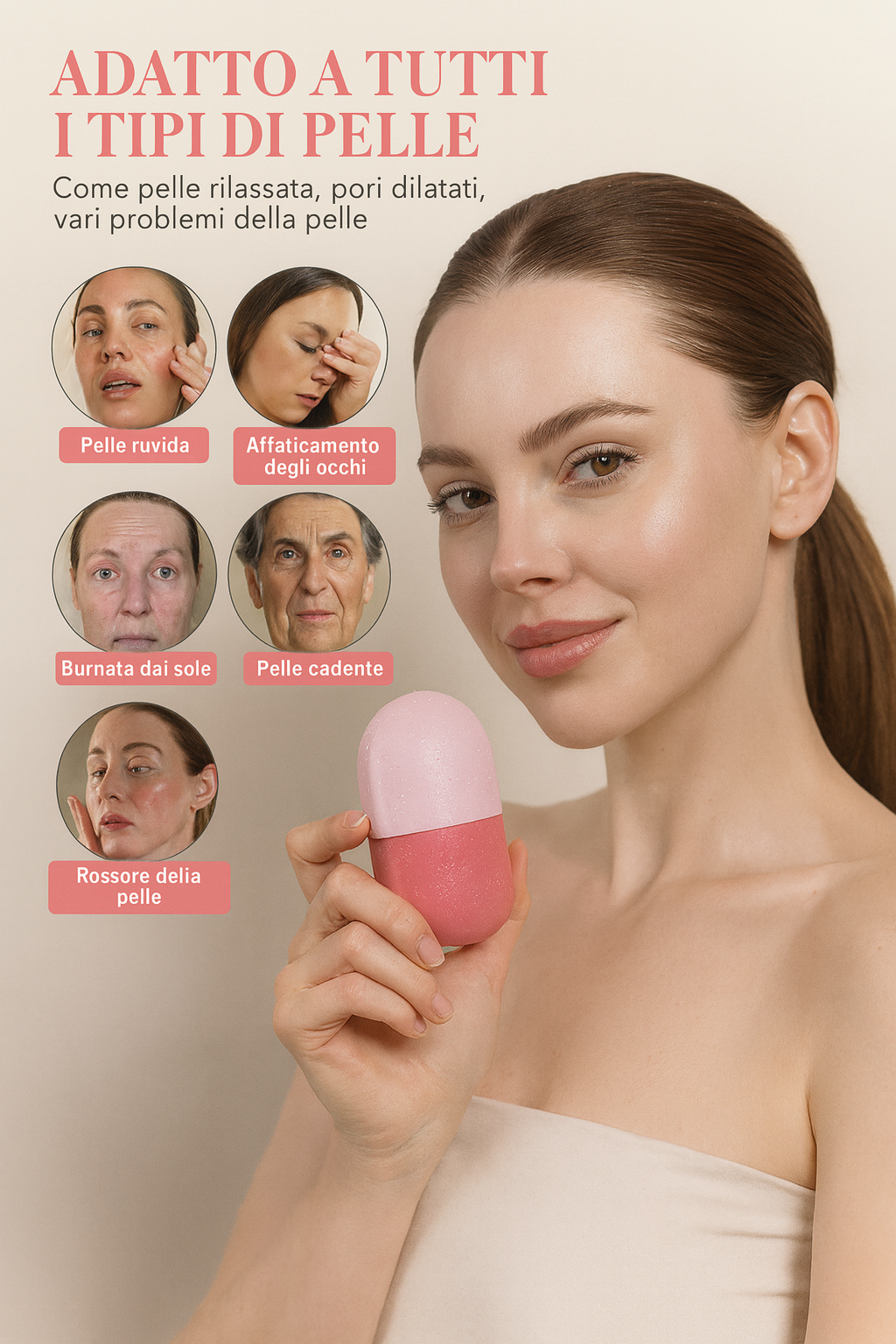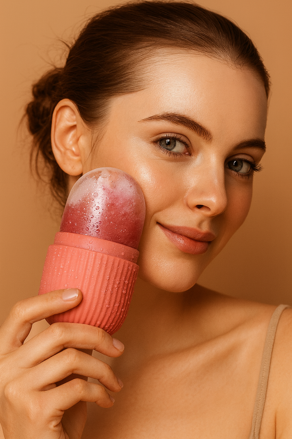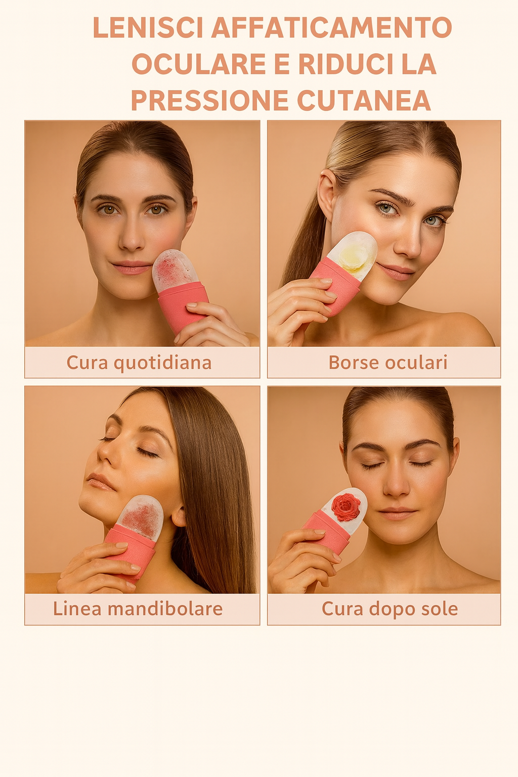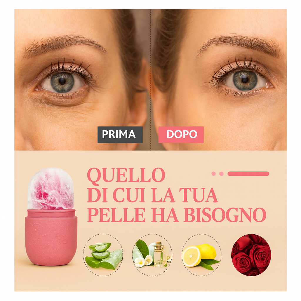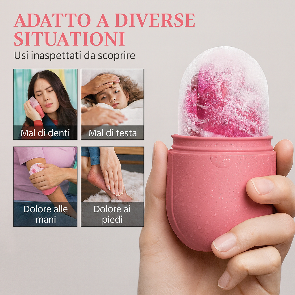 Il nucleo in ghiaccio rilascia un freddo intenso e controllato, mentre l’involucro in silicone morbido scorre delicatamente sul viso, adattandosi alle forme senza irritare.